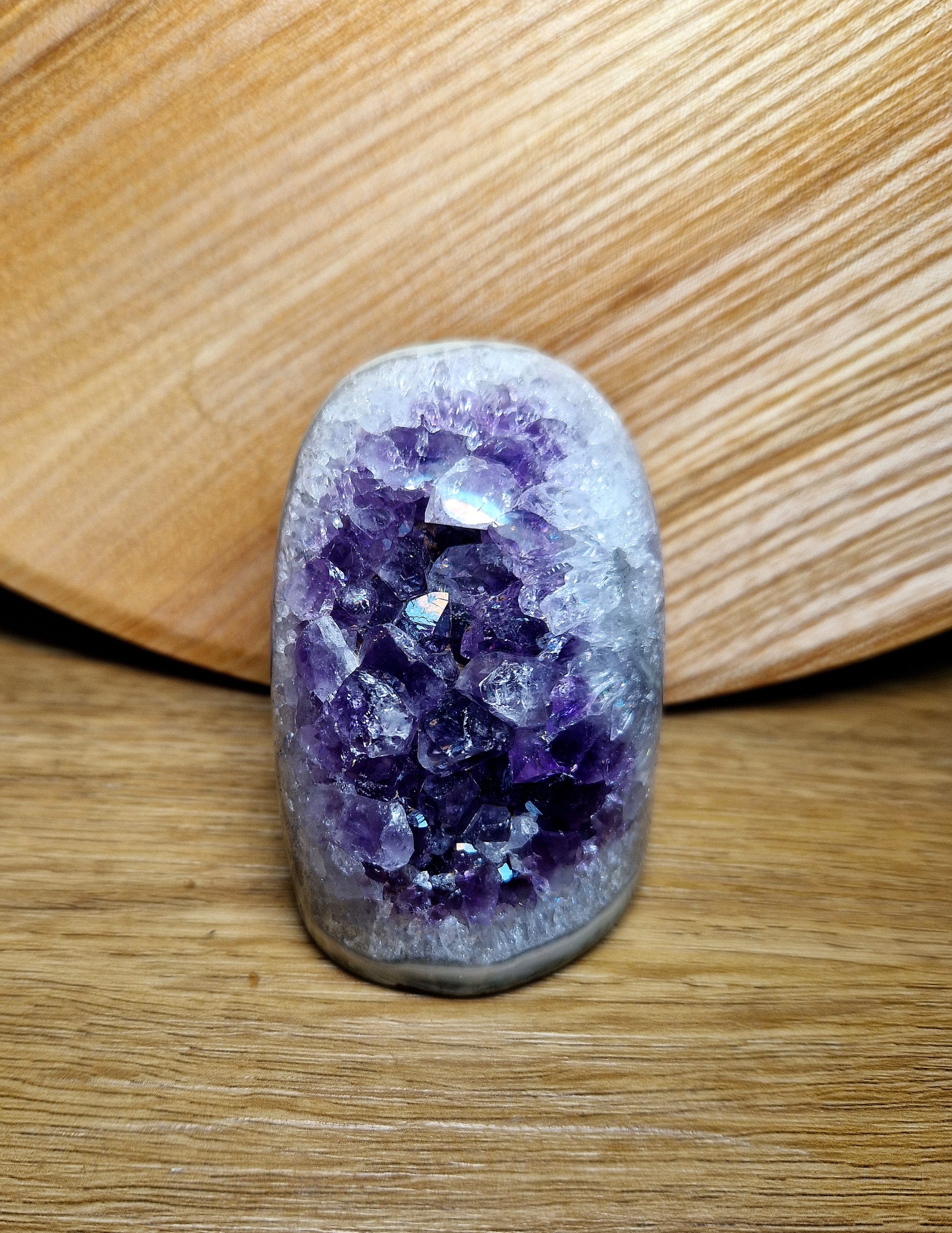 Das Stück ist außen aufwendig poliert und offenbart eine natürliche Drüsenöffnung, in der die Kristalle wunderschön im Licht funkeln.